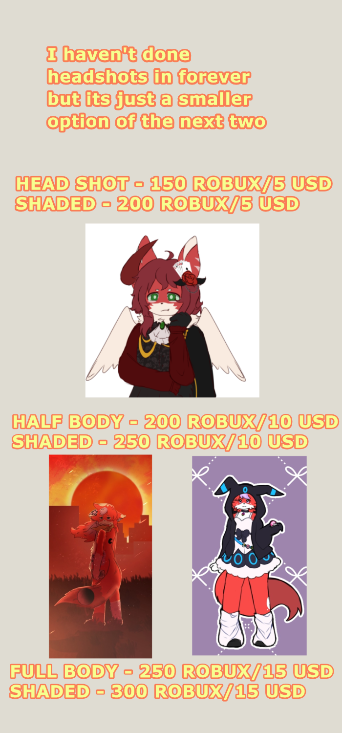 == I will prioritize USD commissions over robux commissions and will let you know beforehand